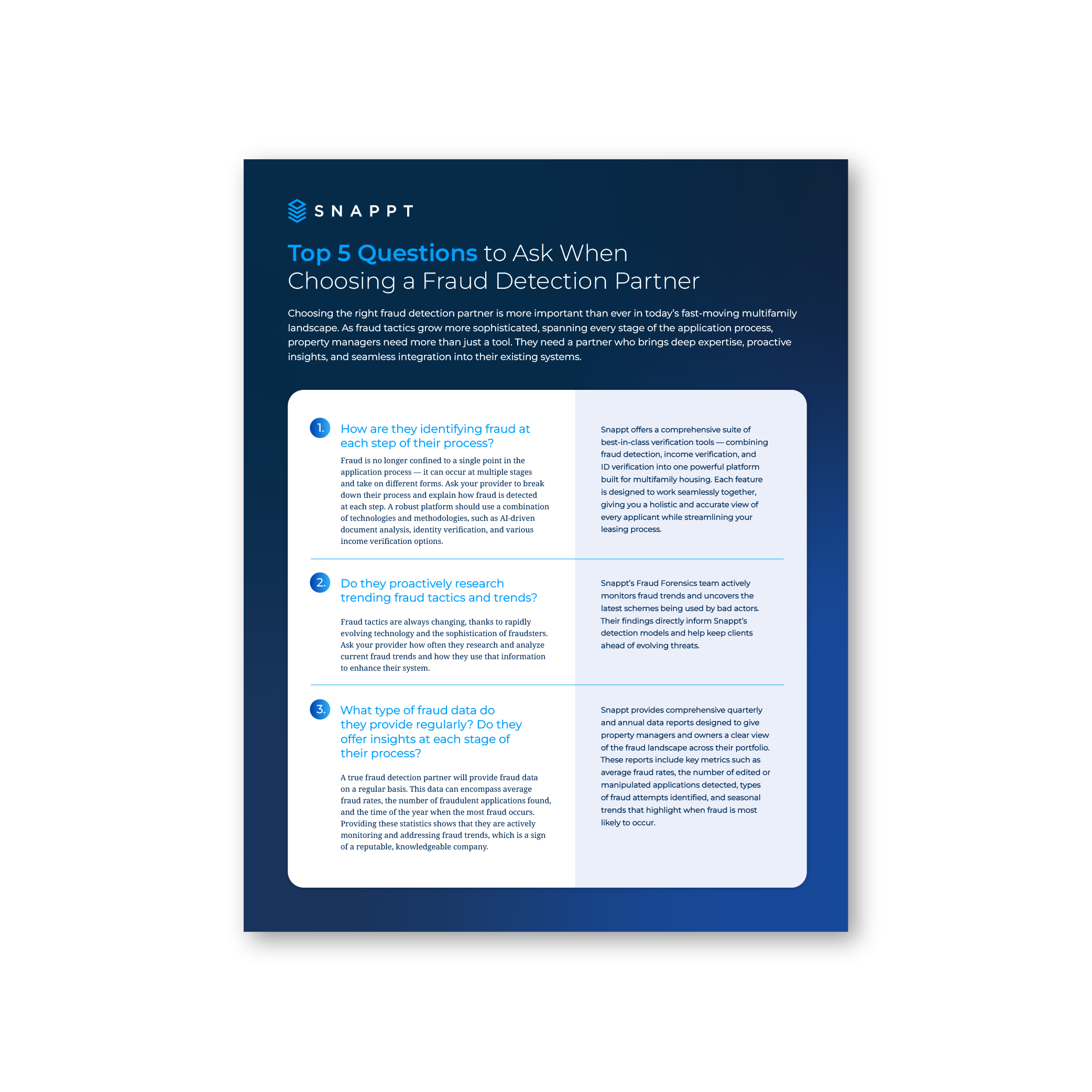 Experience the industry’s leading verification platform — built to stop fraud, verify income, and approve trusted applicants with ease. Fill out the form and a Snappt expert will reach out shortly.