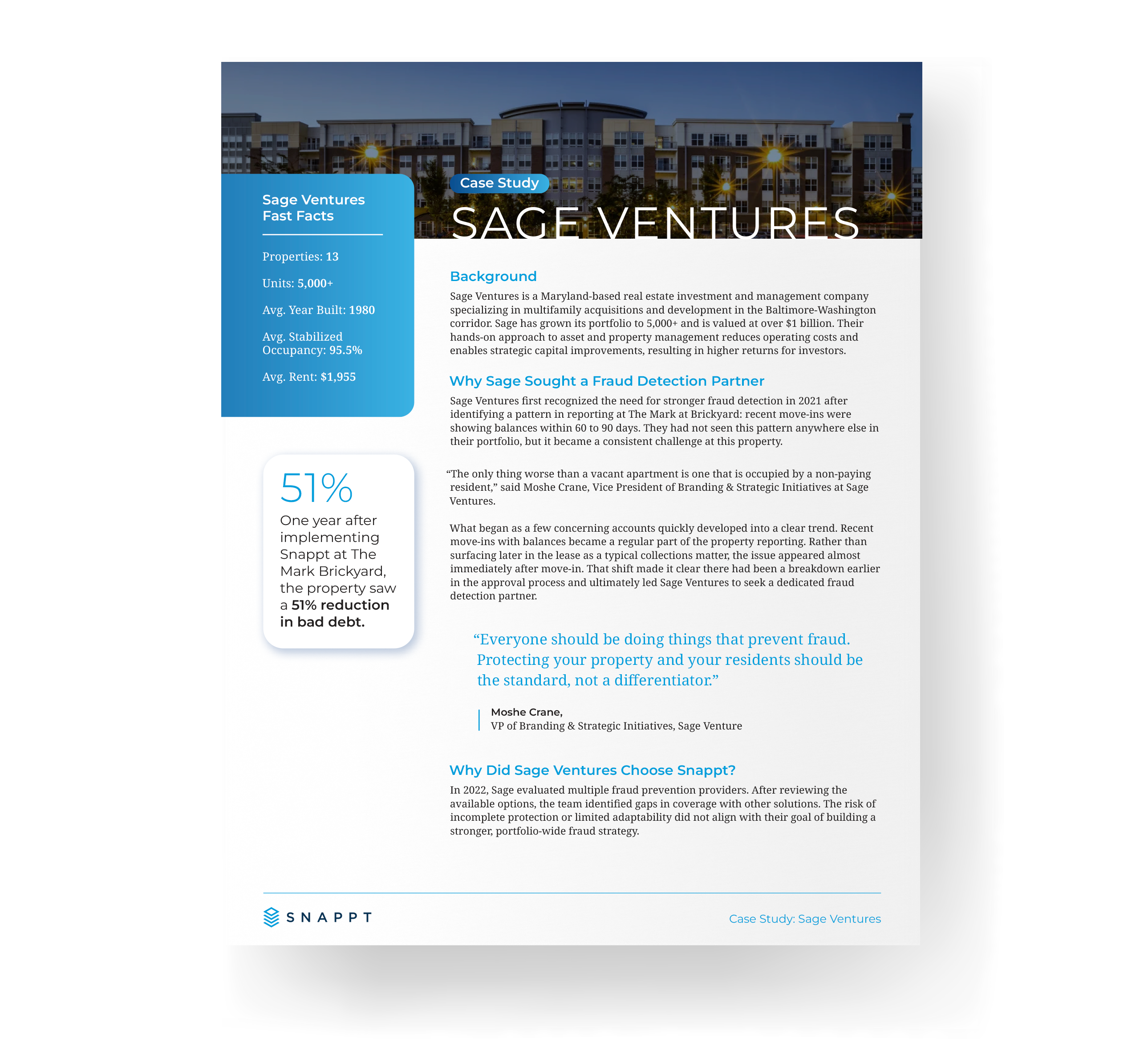 Sage Ventures, a leading multifamily owner-operator, partnered with Snappt to address a growing pattern of early lease delinquencies tied to application fraud. After implementing Snappt at a key property, they achieved a 51% reduction in bad debt within one year. The partnership has since helped them take a more proactive, scalable approach to fraud prevention and protect long-term rent performance.