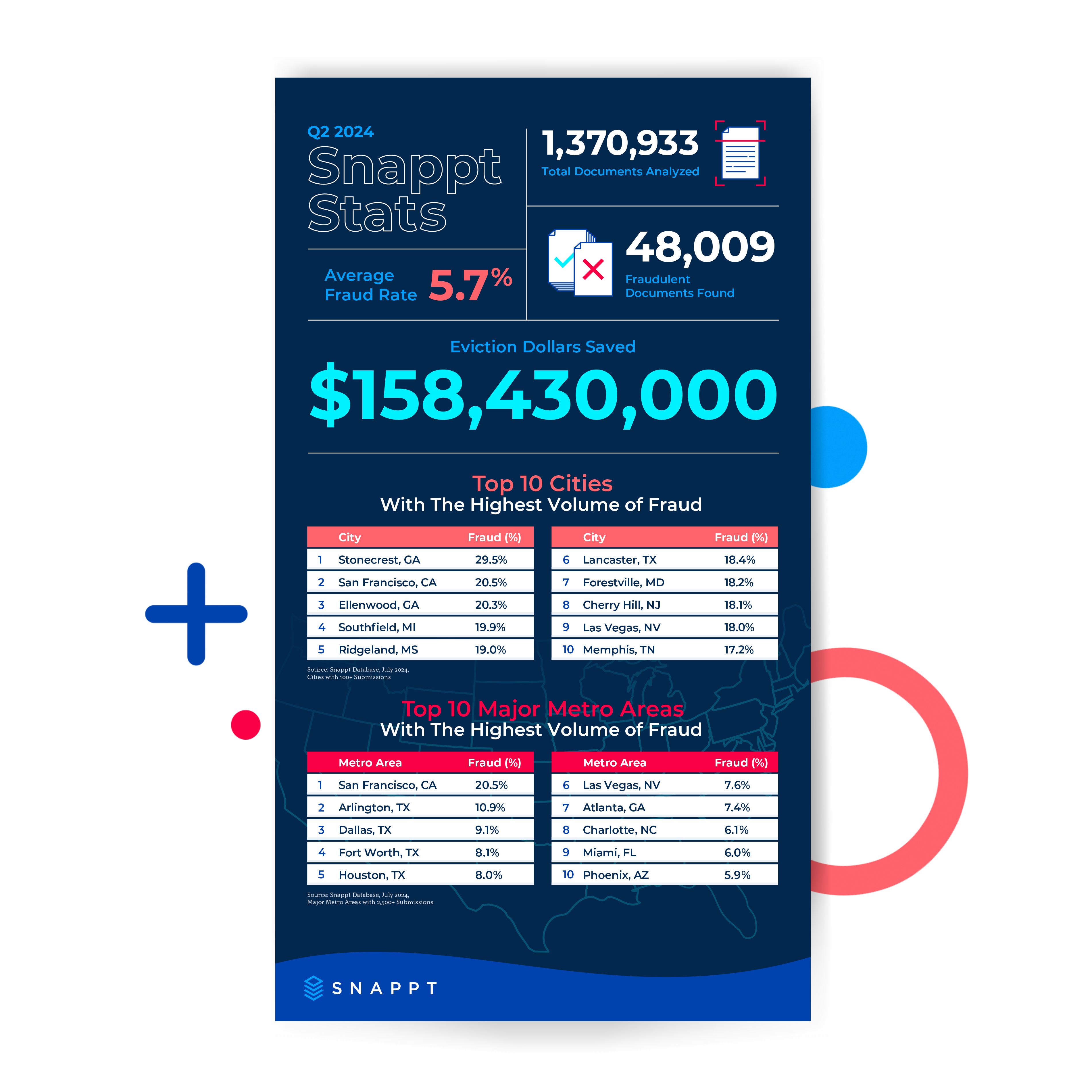 Explore the fast facts of fraudulent applications uncovered by Snappt from April to June of 2024! This data comes from the Snappt database and aims to help you better understand the trends and patterns of fraud, ultimately aiding in the prevention and detection of such activities.
